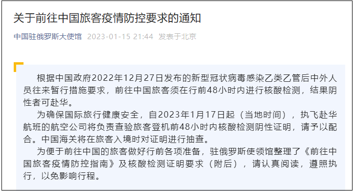 另据梳理,1月15日,中国驻日本大使馆、中国驻韩国大使馆、中国驻俄罗斯大使馆、中国驻加拿大大使馆、中国驻巴西大使馆、中国驻新加坡大使馆等均发布关于前往中国旅客疫情防控要求的通知。其中均提到:前往中国旅客须在行前48小时进行核酸检测,结果阴性者可来华。