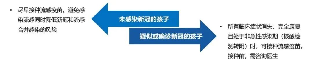 ※ 如果孩子感染了新冠,核酸或抗原呈阳性,则仍处于急性感染期,不建议接种流感疫苗;