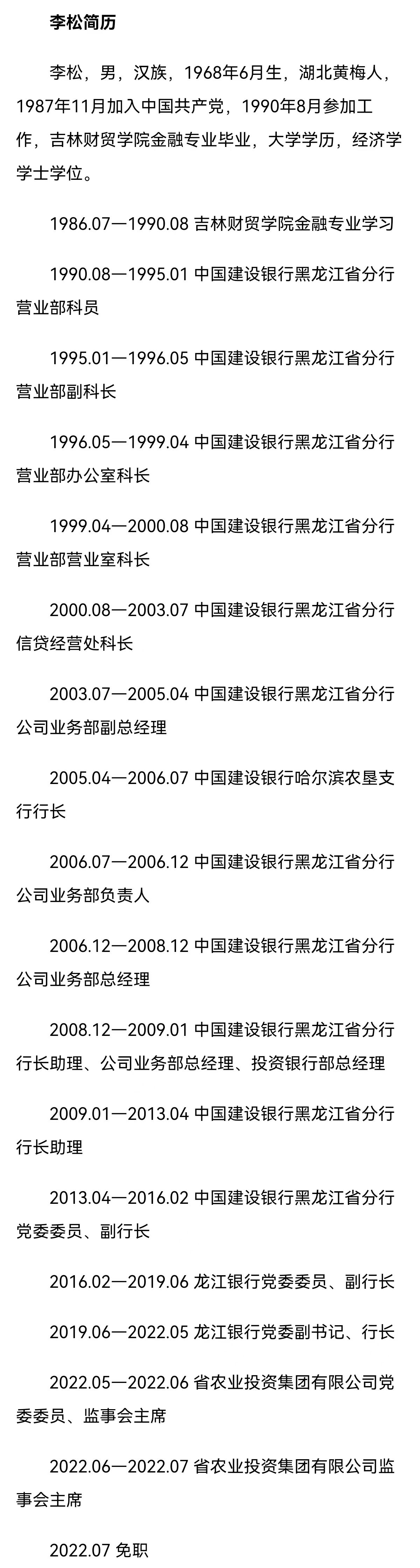 2月3日,黑龙江省纪委监委发布信息:日前,经黑龙江省委批准,黑龙江省纪委监委对省农业投资集团有限公司原党委委员、监事会主席李松严重违纪违法问题进行了立案审查调查。