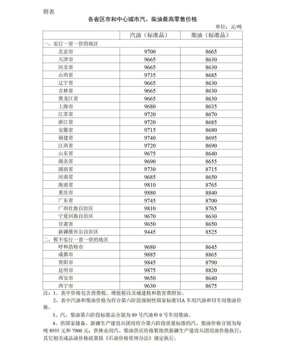 根据近期国际市场油价变化情况,按照现行成品油价格形成机制,自2023年2月3日24时起,国内汽、柴油价格(标准品,下同)每吨分别提高210元和200元。调整后,各省(区、市)和中心城市汽、柴油最高零售价格见附表。相关价格联动及补贴政策按现行规定执行。
