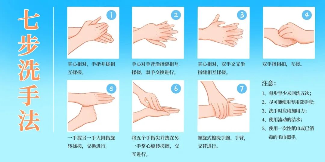 保持手卫生,饭前、便前便后,触摸眼口鼻前,均应用流动水按“七步洗手法”洗手或用免洗手消毒剂或消毒湿巾进行手消毒;