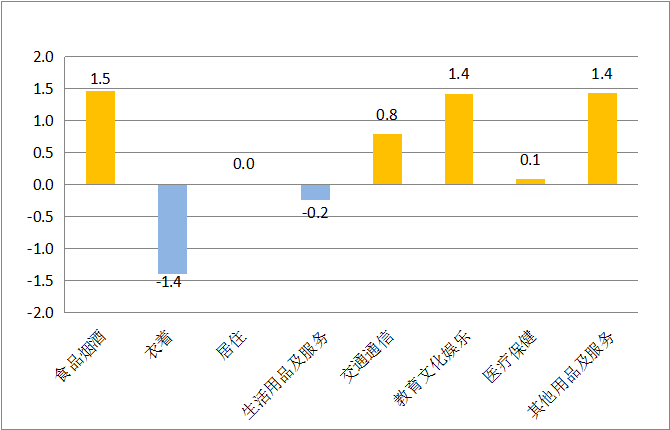 其他七大类价格同比均上涨。其中,其他用品及服务价格上涨4.5%,生活用品及服务价格上涨2.4%,交通通信价格上涨2.2%,教育文娱乐价格上涨2.1%,居住价格上涨0.8%,医疗保健价格上涨0.4%,衣着价格上涨0.4%。
