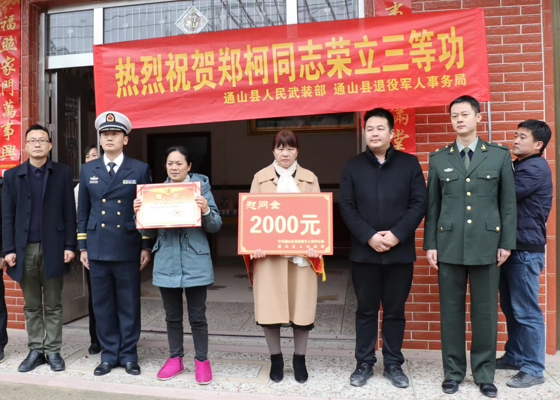 三等功臣郑柯的父母家住在厦铺镇山界路口,当送喜报队伍浩浩荡荡到来时,整条街道喜庆热闹极了,邻里乡亲和过往群众将现场围了个里三层外三层。在锣鼓花炮声中,军地领导将立功喜报、牌扁和奖金送到郑柯的父母手中,向军属表示热烈的祝贺,对他们的付出给予充分的肯定,感谢他们为部队、为国家培养了优秀的军事人才,为家乡争了光。