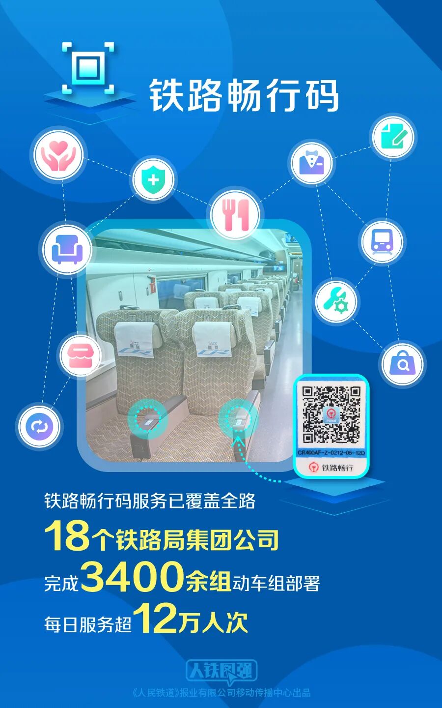 春运路上,你是否注意到列车座椅扶手上的铁路畅行码。在全国3400余组动车组列车上,旅客可以通过扫描这个二维码,查询列车正晚点、运行位置、接续车次、交通接驳、终到站天气情况等出行服务信息,还可以进行补票升席、遗失品查找、点餐等服务。未来,铁路畅行码将向普速列车拓展,让更多人享受舒适的出行体验。