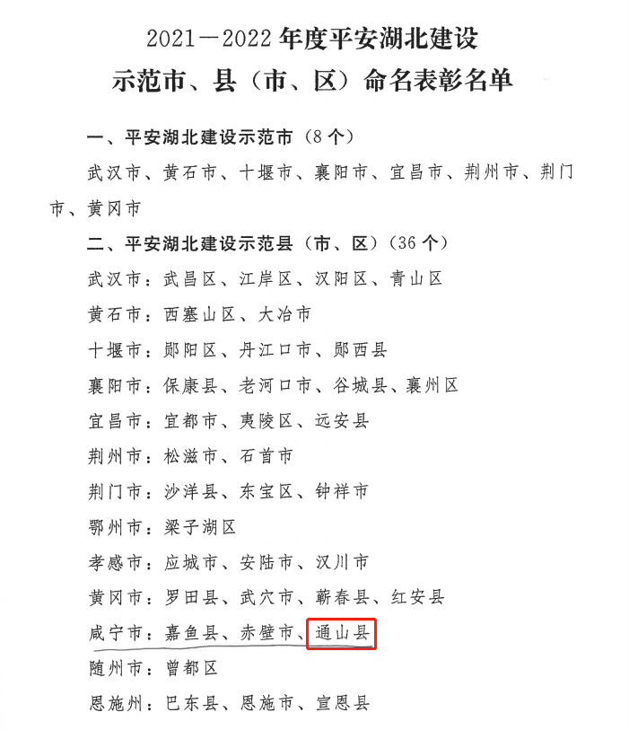云上通山报道:(特约通讯员 柯国强)在2月8日召开的湖北省委政法工作会议上,通山县获得“平安湖北建设示范县”荣誉称号。