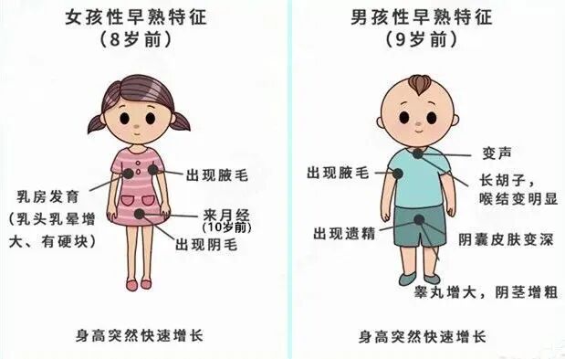俗话说,早长早停止,性早熟会直接影响孩子的成年身高,有的孩子成年后身高要低于普通人群10公分左右。同时,性早熟导致的体型改变及月经或遗精过早,还可能导致患儿出现孤僻、自卑等心理问题。