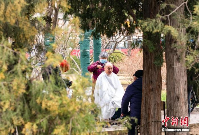 资料图:北京市民在街头休闲区理发。当天是中国农历二月初二,民间有“二月二,剃龙头”的传统习俗,寓意辞旧迎新,带来好兆头。 中新社记者 侯宇 摄