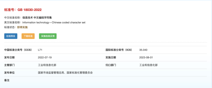 2005年,国家对GB18030进行了一次修订。2022年,GB18030再次修订。GB18030-2022《信息技术 中文编码字符集》于2022年7月19日发布,将于2023年8月1日实施。