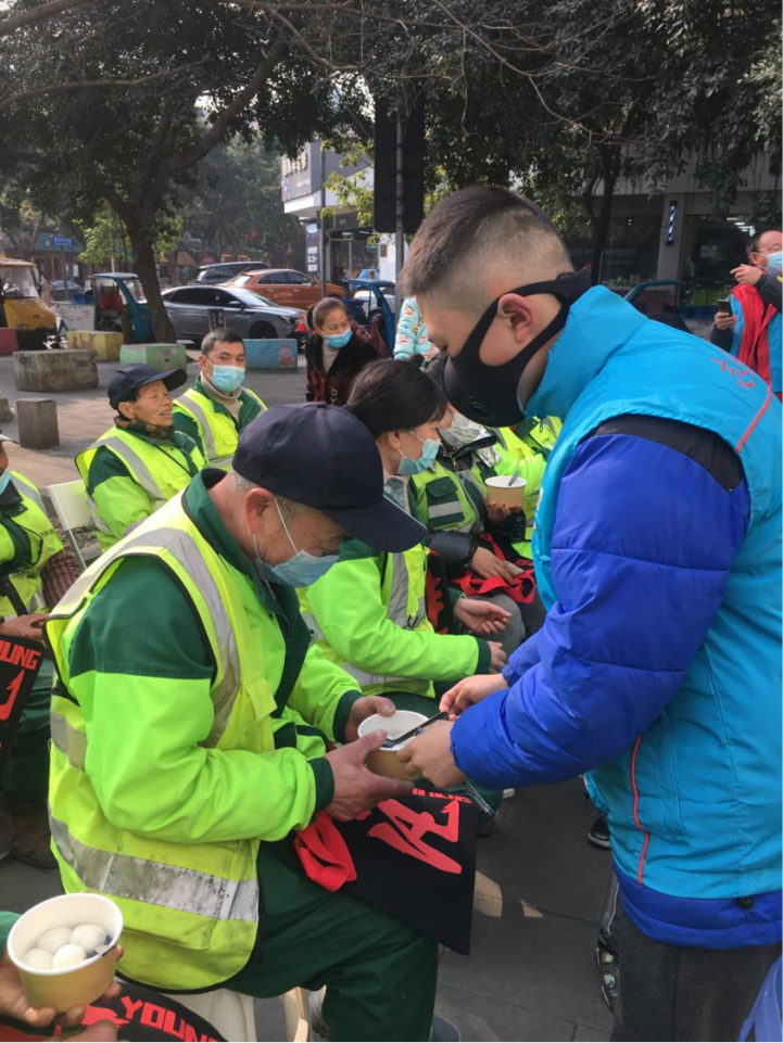 王一帆同学参加社区募集元宵活动,给环卫工人送温暖