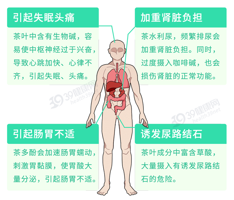 空腹饮茶对胃肠有直接的刺激作用,容易冲淡、稀释消化液,导致消化功能受损。同时,空腹时,茶中的咖啡因等物质更容易被吸收,导致“醉茶”现象。