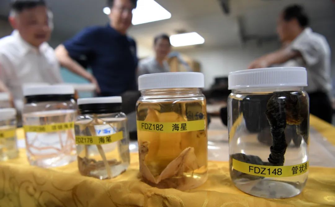 3月11日,“探索一号”科考船携“奋斗者”号全海深载人潜水器抵达三亚,科研人员在介绍采集的深渊宏生物、岩石、结核、沉积物样品。