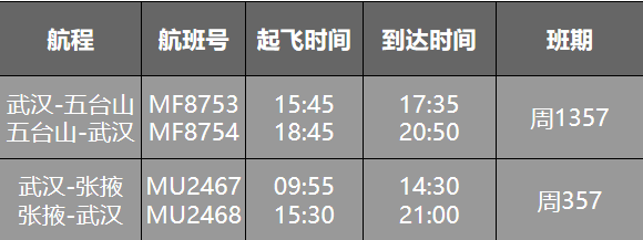 新开航线方面,厦航将在新航季新开武汉-五台山航线,班期为每周1、3、5、7;东航将新开武汉-银川-张掖的航线。班期为每周3、5、7。