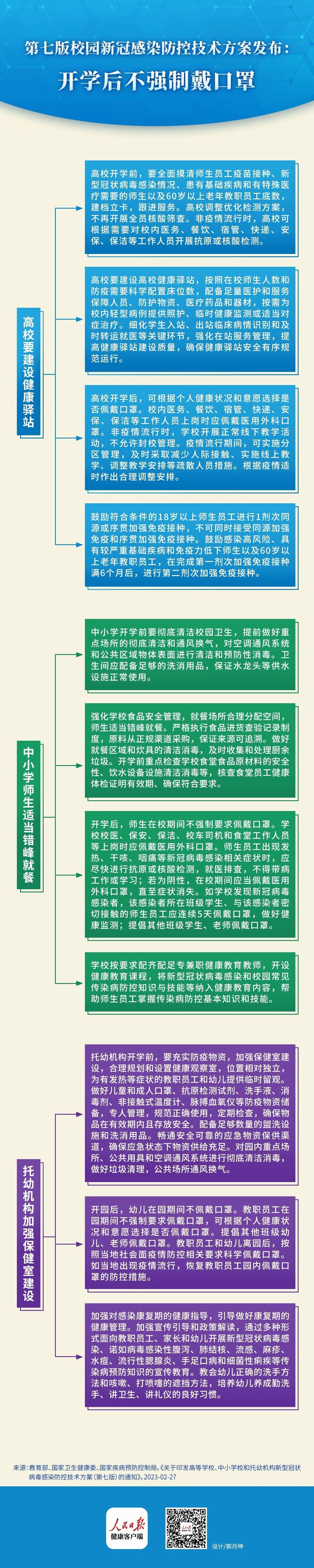 ▶ 开学或开园后,高校、中小学师生和托幼机构教职员工在校(在园)期间不强制要求佩戴口罩,可根据个人健康状况和意愿选择是否佩戴口罩。幼儿在园期间不佩戴口罩。