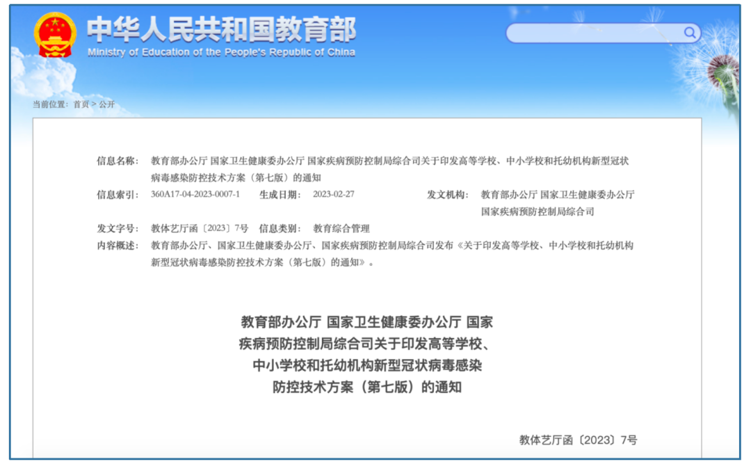 3月13日,教育部办公厅、国家卫生健康委办公厅、国家疾病预防控制局综合司三部委发布《关于印发高等学校、中小学校和托幼机构新型冠状病毒感染防控技术方案(第七版)的通知》。