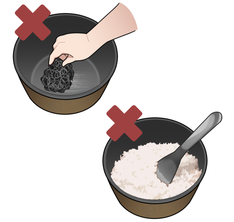 当发生米饭糊底或有顽固污渍时,很多人喜欢用钢丝球清洁,殊不知这种方式容易磨损内胆,使涂层加快脱落。用金属铲盛饭也是同样道理,金属材质较硬,也容易造成涂层破坏。