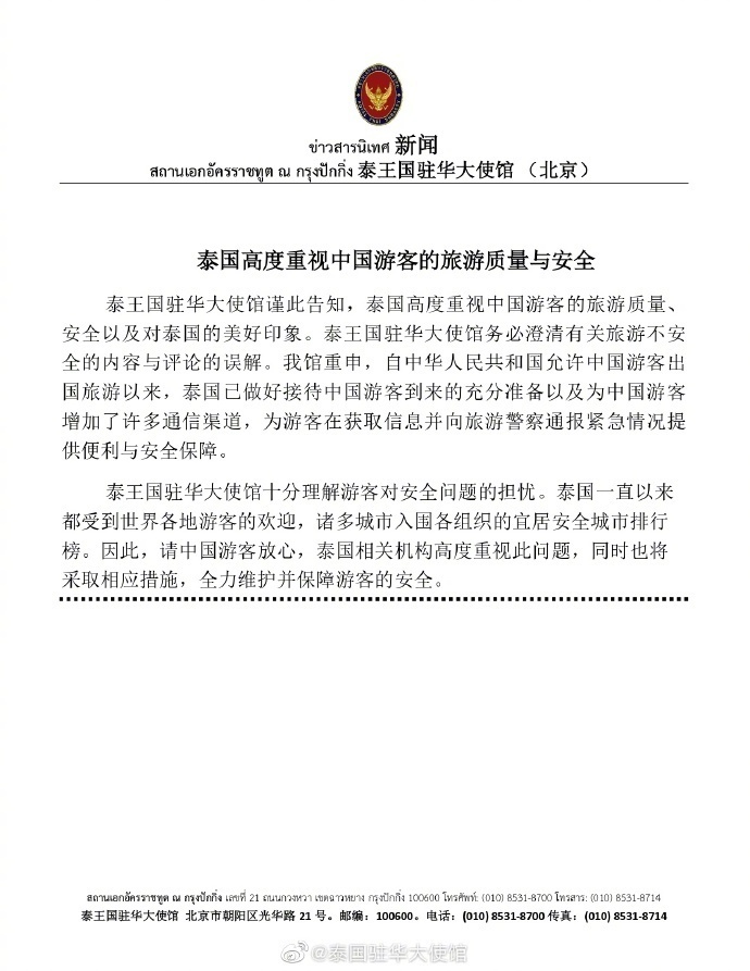 3月23日,泰国驻华大使馆在微博上发文称,泰国高度重视中国游客的旅游质量、安全以及对泰国的美好印象。泰王国驻华大使馆务必澄清有关旅游不安全的内容与评论的误解。