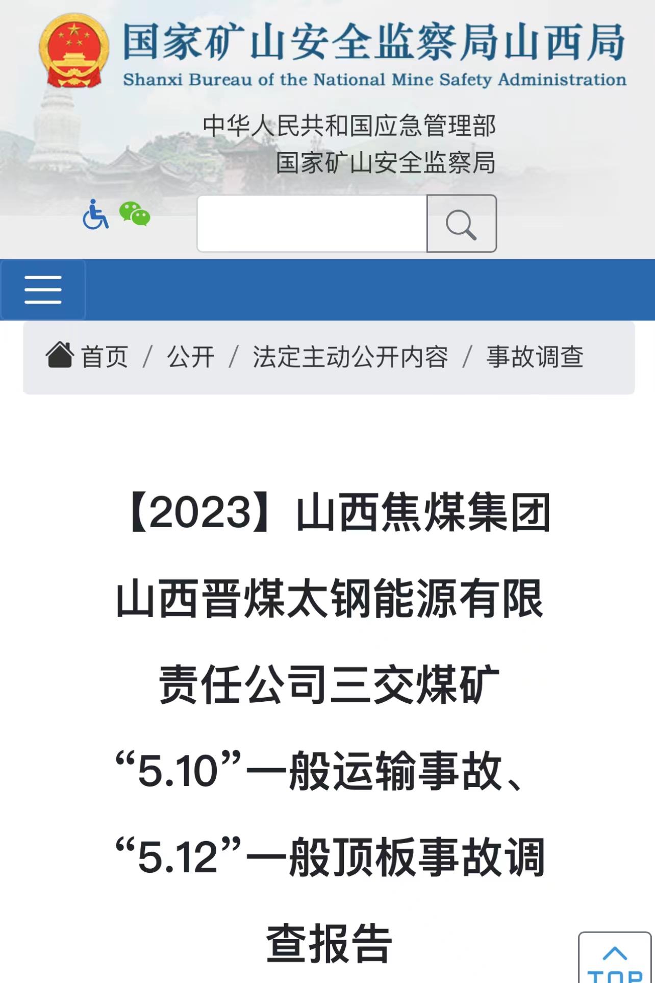 2022年5月10日15时23分,山西晋煤太钢能源有限责任公司三交煤矿一号副立井井口主罐笼北口发生一起一般运输事故,造成1人死亡。2022年5月12日0时45分许,三交煤矿中部集中辅助运输大巷223.5m处发生一起一般顶板事故,造成1人死亡、1人受伤。两起事故发生后,矿方均未按规定上报,蓄意瞒报。经媒体举报,由吕梁市人民政府核查属实后,依据相关法律法规规定,国家矿山安全监察局山西局牵头成立山西晋煤太钢能源有限责任公司三交煤矿“5·10”一般运输事故、“5·12”一般顶板事故调查组,对该两起事故展开调查。