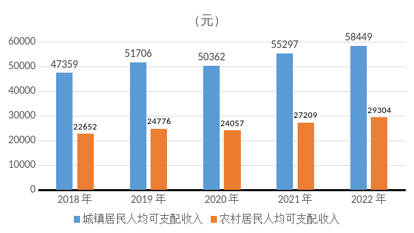 按常住地分,城镇居民人均可支配收入58449元,比上年增长5.7%;农村居民人均可支配收入29304元,增长7.7%。