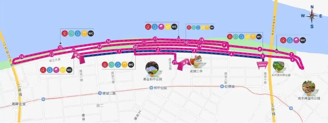半程马拉松路线为:临江大道建设一路交叉口(起点)—临江大道(武丰闸湿地公园折返)—青山长江大堤(二七长江大桥下折返)青山江滩绿道—青山江滩建设八路闸口—临江大道(建设四路折返)—建设五路—武钢三中西门(半程马拉松终点)