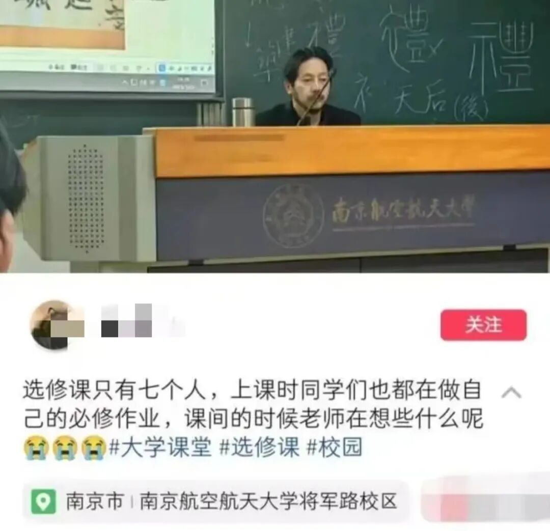 最近,南京航空航天大学一名同学分享的照片引发不少人的关注。图片中,一位老师坐在讲桌前,没有慷慨激昂的陈词,黑板上是稀稀落落的板书。该同学在配文中写道:选修课只有7个人,上课时同学们也都在做自己的必修作业,课间的时候老师在想些什么呢?