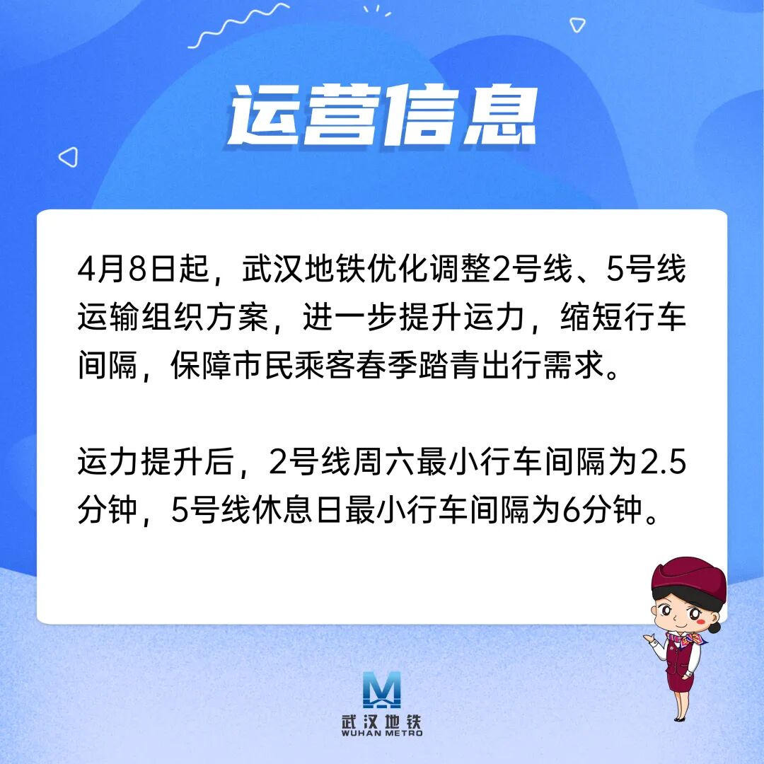 今起,武汉地铁2号线、5号线有调整! 2023-04-08 10:11 0 记者从@武汉地铁运营 获悉 从今天(8日)起 武汉地铁优化调整 2号线、5号线运输组织方案 进一步提升运力 缩短行车间隔 运力提升后 2号线周六 最小行车间隔为2.5分钟 5号线休息日最小行车间隔为6分钟 来源:长江日报