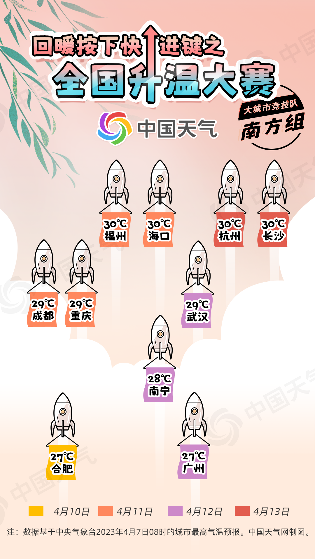 据悉,南方地区,虽然升温势头不如北方迅猛,但升温待机时间较长,可持续至13日。福州、海口将在4月12日率先冲上30℃,更靠北的杭州、长沙等地或在13日迎来今年首个30℃,武汉也将在12日达到29℃。