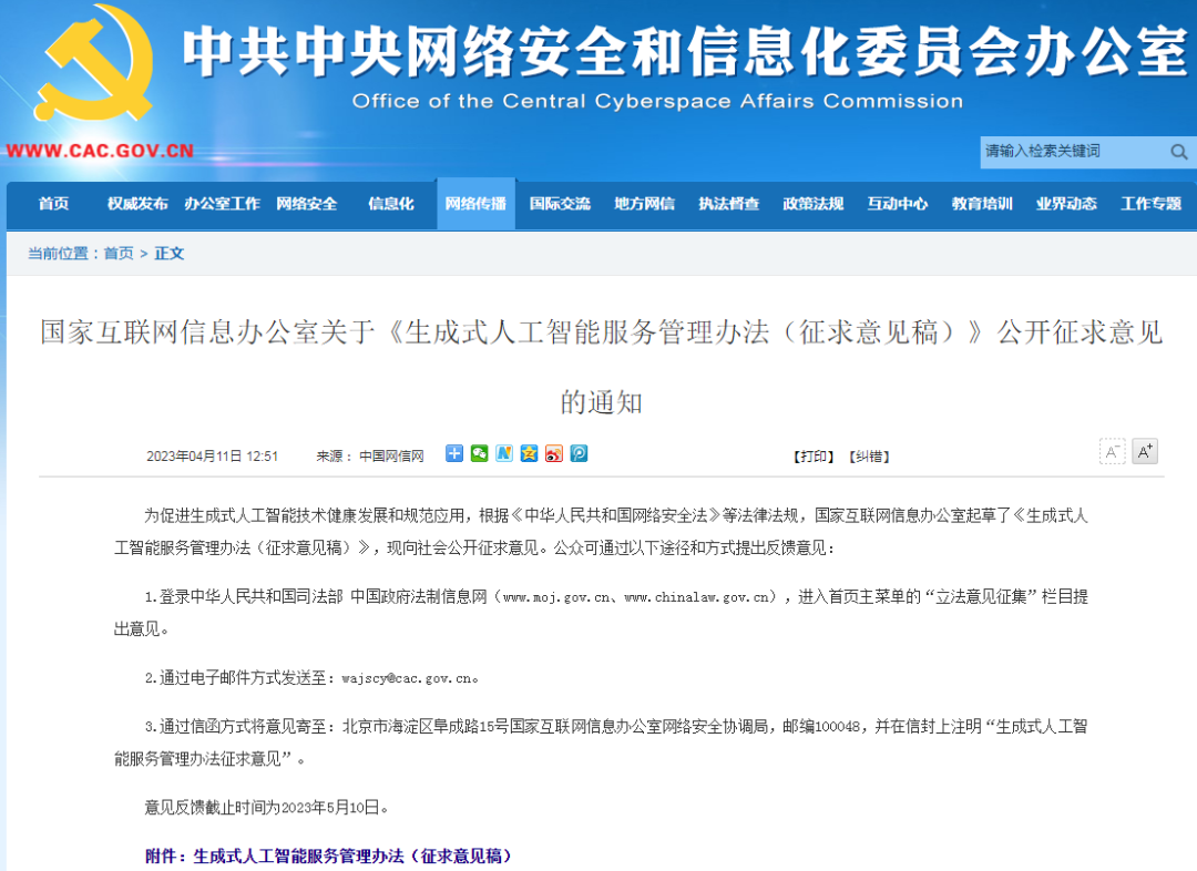 据国家互联网信息办公室官网消息,为促进生成式人工智能技术健康发展和规范应用,根据《中华人民共和国网络安全法》等法律法规,国家互联网信息办公室起草了《生成式人工智能服务管理办法(征求意见稿)》,其中提出生成式人工智能产品提供服务前需申报安全评估。
