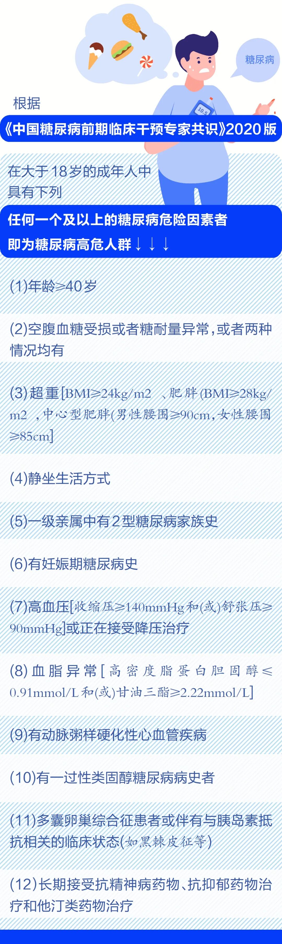 根据2020年版《中国糖尿病前期临床干预专家共识》,高危人群可以给自己打个分,如果总分大于25分,建议去医院排查。