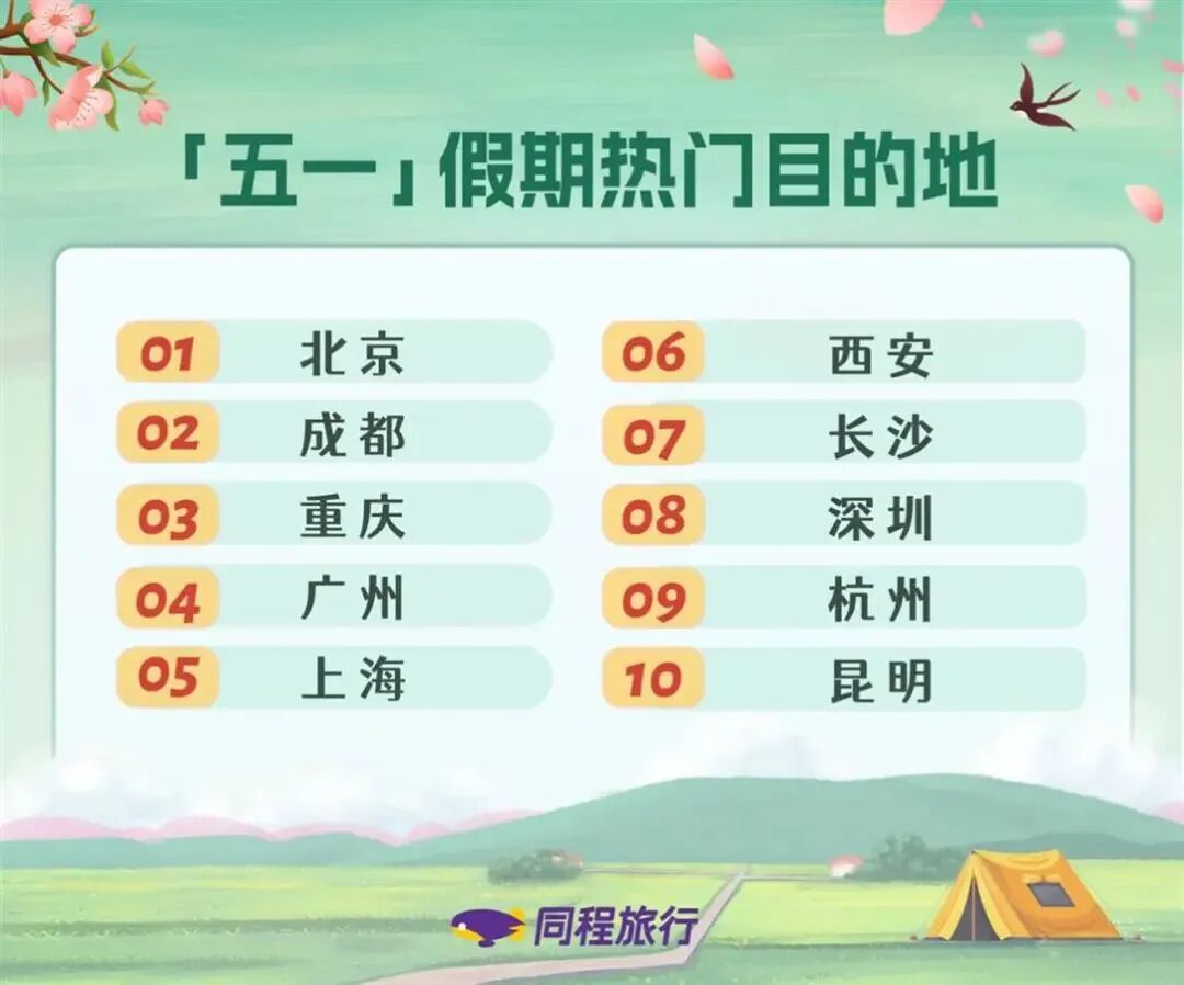 同程旅行大数据显示,截至4月11日,五一假期最受关注的国内目的地为北京、成都、重庆、广州、上海、西安、长沙、深圳、杭州、昆明。受近期爆火的“特种兵旅游”影响,过半数游客在五一假期预订了两个或两个以上目的地城市的旅游产品。