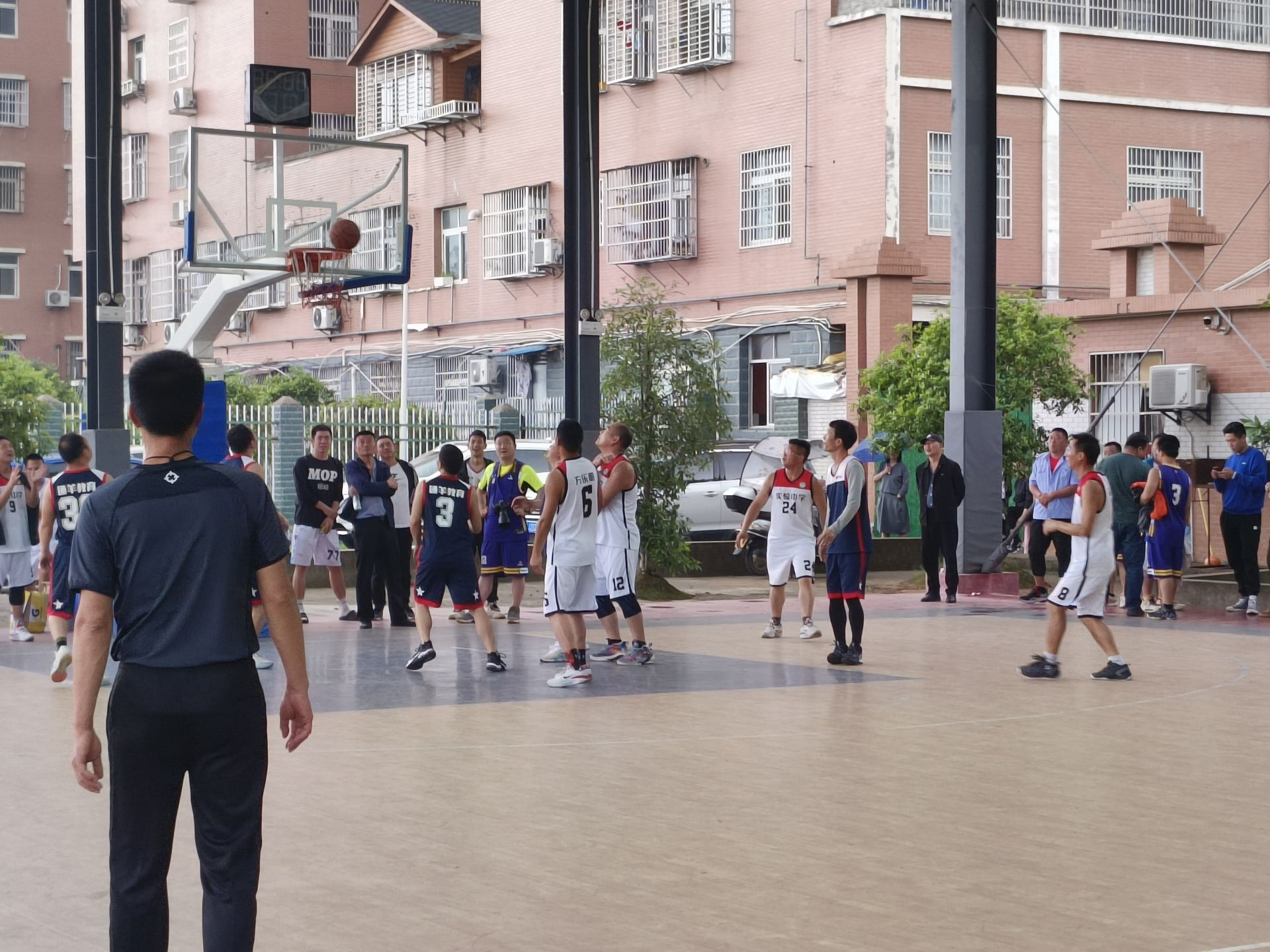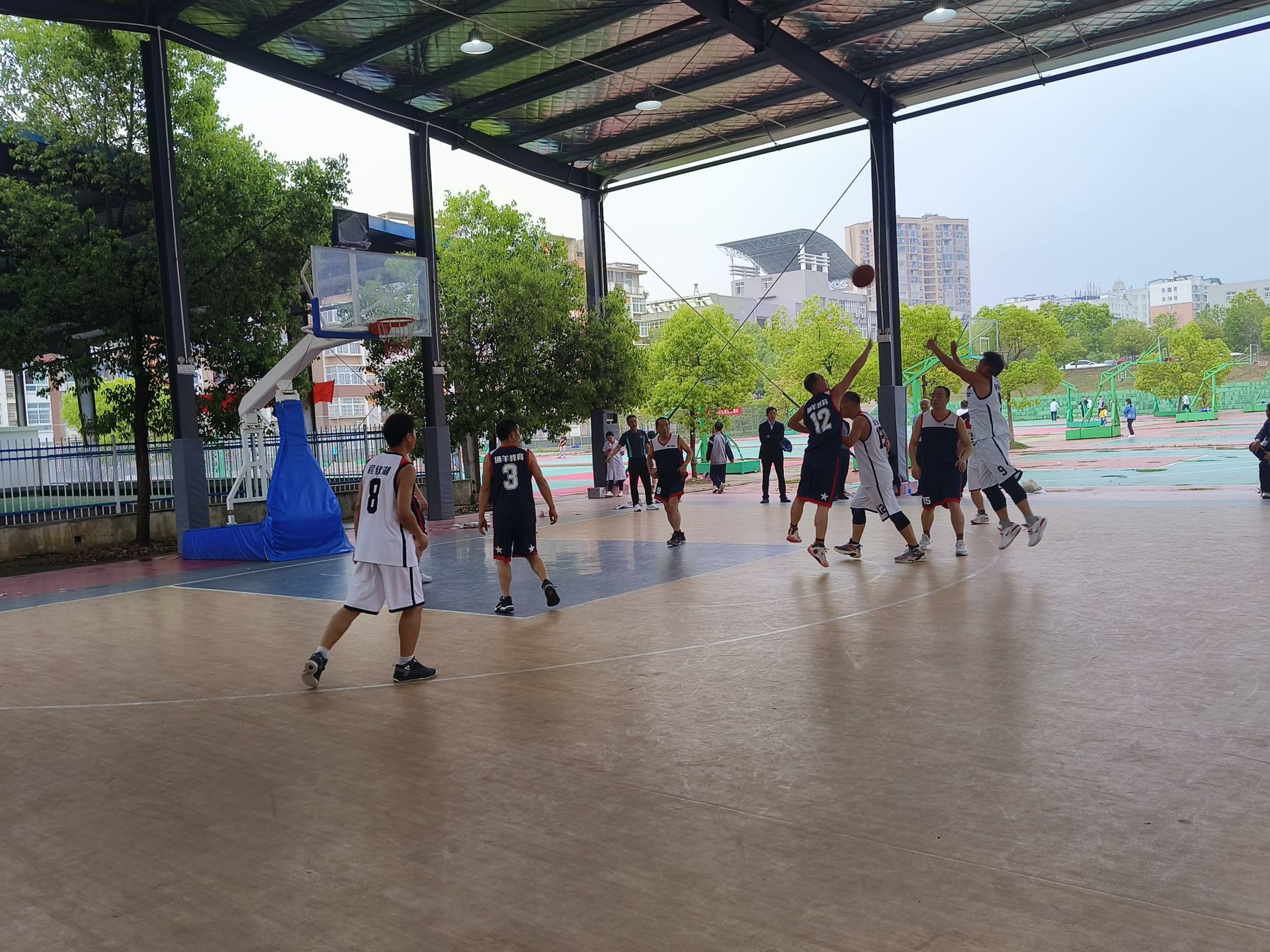 哨声响,赛事起。教师们身手敏捷、步伐矫健,凭借精湛的球技,默契的配合,用娴熟的传球破解联防战术,用快攻击溃对方防守。对胜利的渴望,让每一位队员火力全开,精准三分、当机抢断、默契传球、灵活上篮,一系列动作行云流水,一气呵成……堪比职业篮球赛的战术和技术动作,在赛场上频频上演。两队教师的青春力量跃然赛场,篮筐下你争我夺、你攻我守,每一次篮球划过指尖飞向篮筐的时候,都牵动着赛场内外的每位观众的心跳。观众席热情高涨,为犀利的传球叫好,为华丽的转身惊叹,为精准的三分喝彩,尖叫与呐喊交织,团结与竞争同在,比赛与友谊同存!正可谓:飒爽英姿现舞台,登场竞技秀人才。合心聚力势头旺,各显风采次第开。此消彼涨分伯仲,虎跃龙骧飞将来。观众喝彩声不断,队员抖擞见情怀。