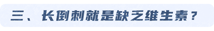 很多人觉得出现倒刺是因为身体缺乏维生素,但实际上维生素跟倒刺的形成并无太大关联,倒刺产生的两大主要原因是皮肤干燥和物理摩擦。
