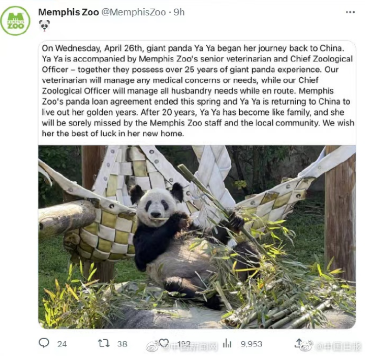据了解,“丫丫”是一只雌性大熊猫,2000年8月3日出生于北京动物园。2003年4月,不到3岁的“丫丫”和雄性大熊猫“乐乐”一起从北京出发,经过长途飞行,穿过国际日期变更线,抵达美国,在孟菲斯动物园开始了旅居生活。2013年,两只熊猫为期10年的租借期结束后,孟菲斯动物园与中国动物园协会签订协议,将租借期再延长10年。2022年12月21日,孟菲斯动物园宣布,将把旅美大熊猫丫丫和乐乐归还中国,结束20年的租借期。