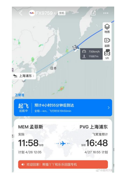 据最新消息,旅居美国的大熊猫“丫丫”于今天(4月27日)下午4点24分到达上海浦东国际机场,比预计时间提前了20分钟左右。此前,“丫丫”在当地时间4月26日上午启程离开田纳西州孟菲斯动物园,乘坐联邦快递 FX9759航班回国,北京时间4月27日凌晨从美国孟菲斯国际机场起飞。