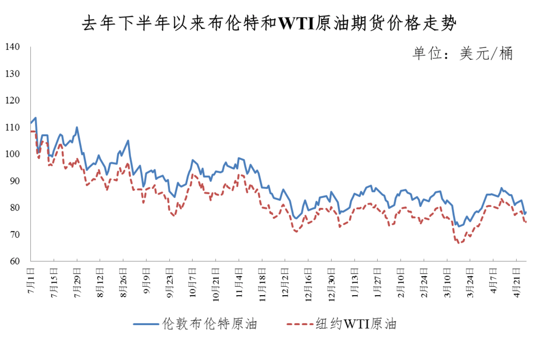 调价周期内,市场对原油需求疲软的担忧,抵消了“欧佩克+”减产带来的影响,油价呈现震荡下降走势。欧美等发达经济体通胀水平居高不下,3月欧元区剔除能源、食品和烟酒价格的核心CPI创历史新高;美国核心CPI止跌回升;英国核心CPI与上月持平未见放缓。市场预计欧洲央行、美联储、英国央行将继续采取加息的手段对抗通胀,全球经济陷入衰退的风险加大,原油需求将受到抑制。受此影响,油价震荡下降至近一个月低点。平均来看,本轮调价周期伦敦布伦特、纽约WTI油价分别比上个调价周期下降3.84%、3.54%。