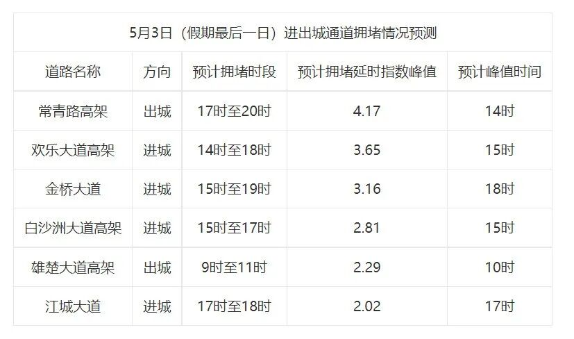5月1日,武汉市日均在途车流量较去年同期上升25%以上,截至5月1日21时,全市道路交通情况整体平稳有序。预计五一假期最后一天(5月3日) 将会出现较集中的返程车流高峰,拥堵时间预计在15时至18时。