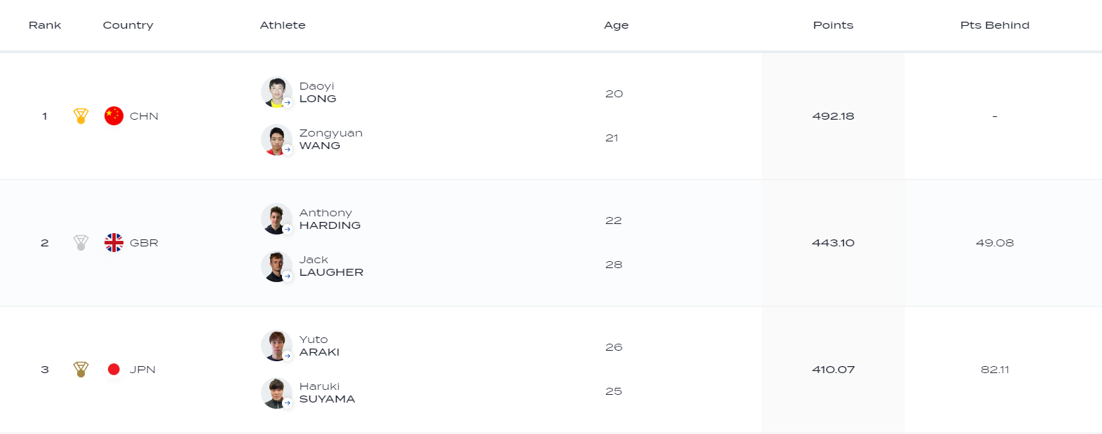 跳水世界杯:龙道一/王宗源男双3米板封王 2023-05-07 11:11 0 北京时间5月7日凌晨,世界泳联跳水世界杯蒙特利尔站继续进行。在男双3米板的决赛中,中国组合龙道一/王宗源一路领先,以492.18分轻松夺得冠军。英国组合和日本组合分别将亚军和季军收入囊中。 来源:央视新闻客户端