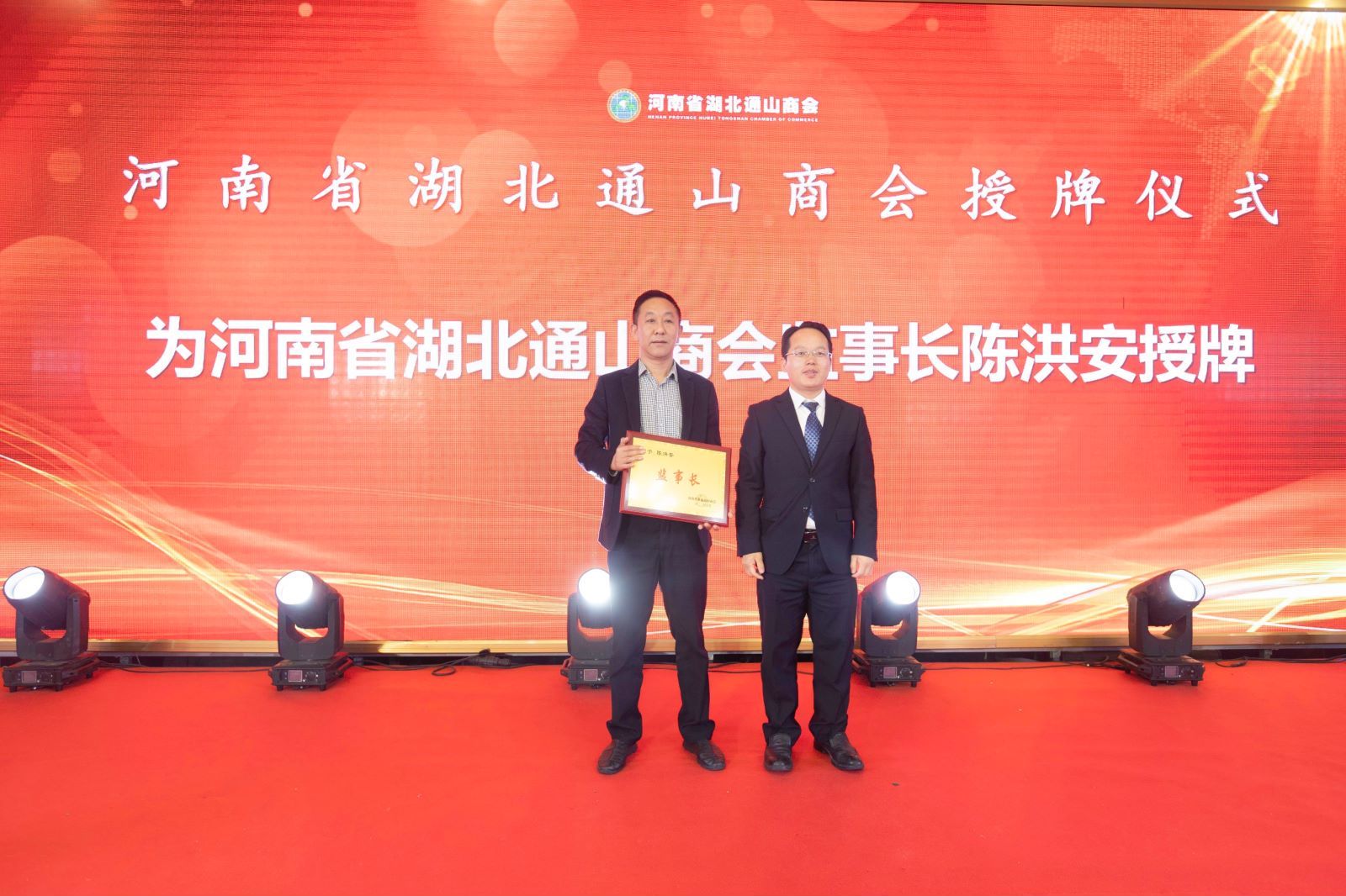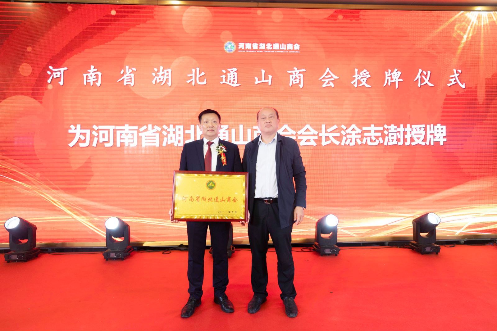 吴柏林为河南省湖北通山商会及会长授牌;杜兵为河南省湖北通山商会监事长授牌;吴新明为河南省湖北通山商会名誉会长授牌;会上还分别为副会长、人才工作站等进行授牌。