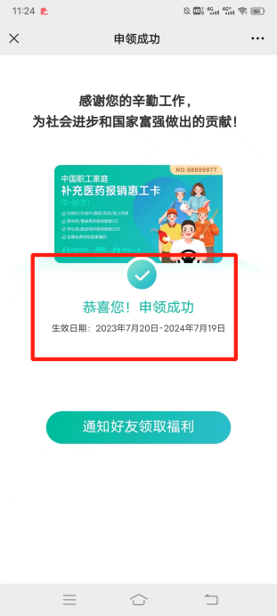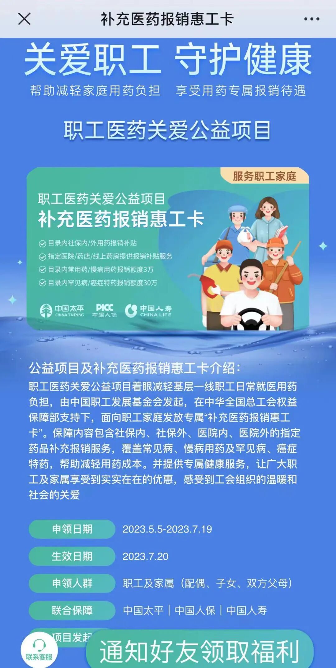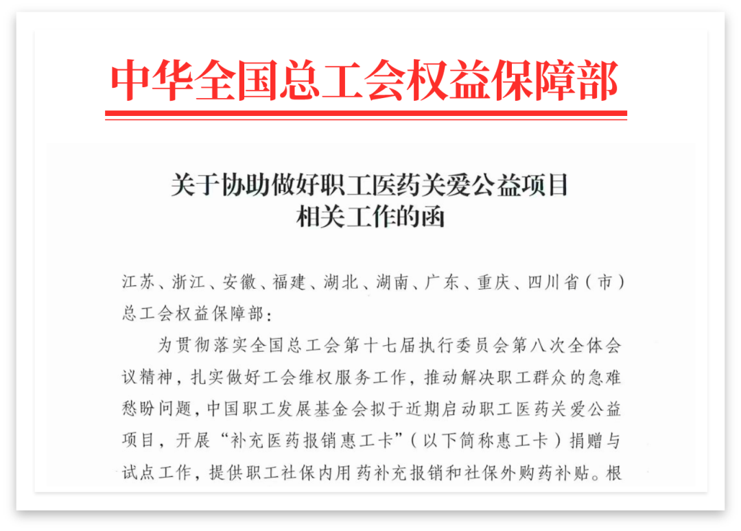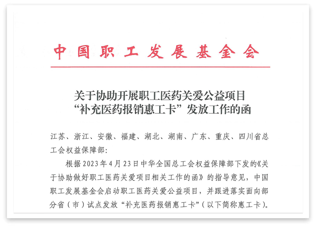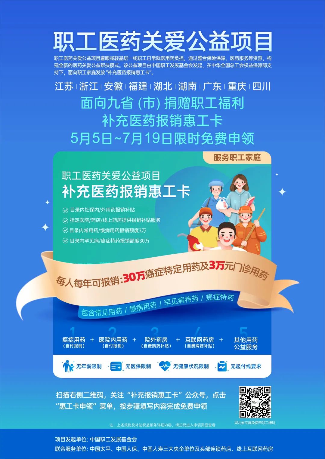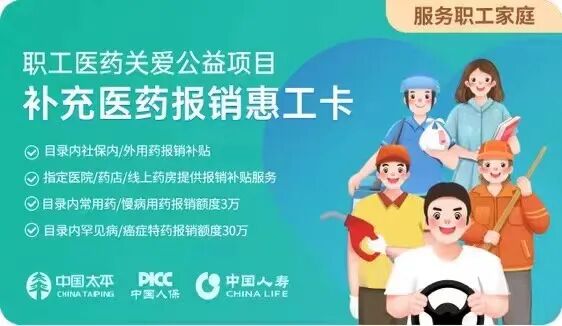 中国职工发展基金会职工医药关爱公益项目着眼减轻基层一线职工日常就医用药负担,通过整合保险保障、医药服务、信息技术等资源,构建全新的医药关爱公益帮扶模式。该公益项目在全国总工会权益保障部指导下,由中国职工发展基金会发起,面向全国职工家庭发放专属“补充医药报销惠工卡”。据悉,职工家庭“补充医药报销惠工卡”由中国太平、中国人保、中国人寿三大央企联合承保,各地头部连锁药店、互联网药房、健康服务企业等联合服务。