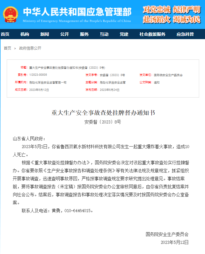 2023年5月1日,你省鲁西双氧水新材料科技有限公司发生一起重大爆炸着火事故,造成10人死亡。