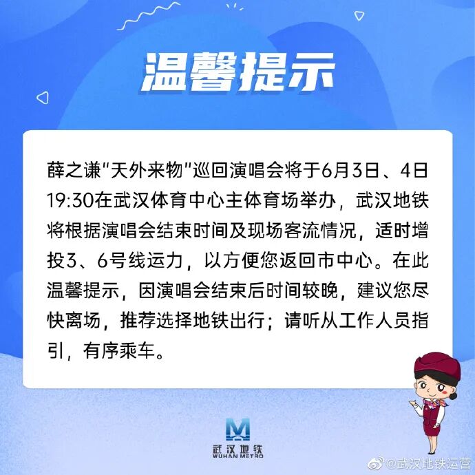 6月3日、4日19:30,武汉体育中心主体育场举办演唱会,武汉地铁将根据演唱会结束时间及现场客流情况,适时增投3、6号线运力,方便您返回市中心。在此温馨提示,因演唱会结束后时间较晚,建议您尽快离场,推荐选择地铁出行;请听从工作人员指引,有序乘车。