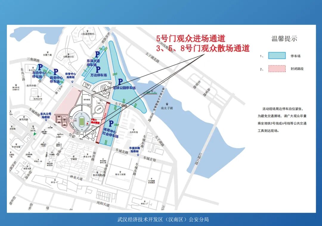 1.由于活动规模较大,体育中心周边道路车流量增多,前往体育中心周边的人员请尽量错峰出行,高峰时段请做好出行规划,尽量避免进入体育路(东风大道至神龙大道)、太子湖路(体育路至芳草路)、体育东路、车城北路(体育路至体育东路)、宁康路路段,可选择绕行神龙大道、沌阳大道、太子湖北路、江城大道等外围道路。