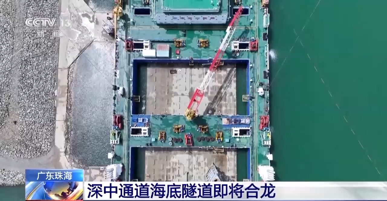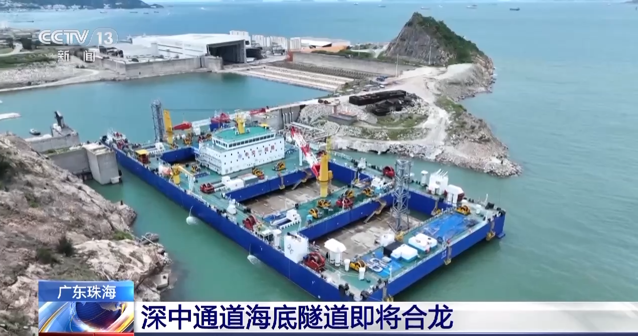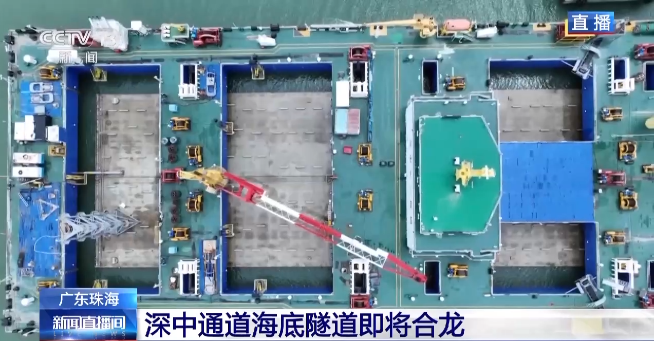 总台记者 吴媚苗:在珠海桂山岛的深中通道沉管预制厂,世界首艘沉管浮运安装一体船已经与海底沉管隧道的最后一节管节——E23管节以及最终接头完成“合体”,管节就搭载在一体船的下方。