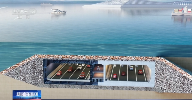 总台央视记者 李伟代:深中通道西人工岛,是深中通道桥隧转换的关键构造,从这里开始,深中通道将从桥梁部分转入全长6845米海底隧道部分,未来汽车将从这里驶向海平面下,最深将在海底40米的沉管中行驶。