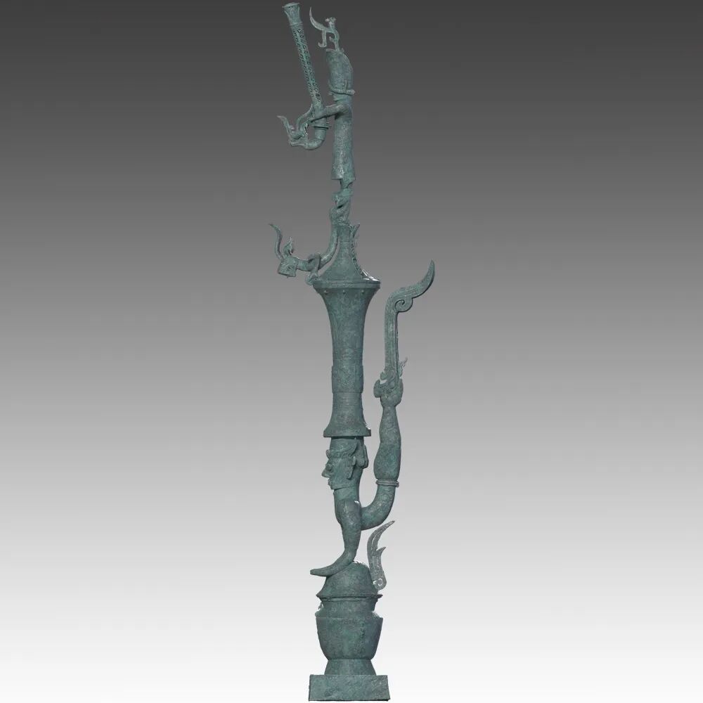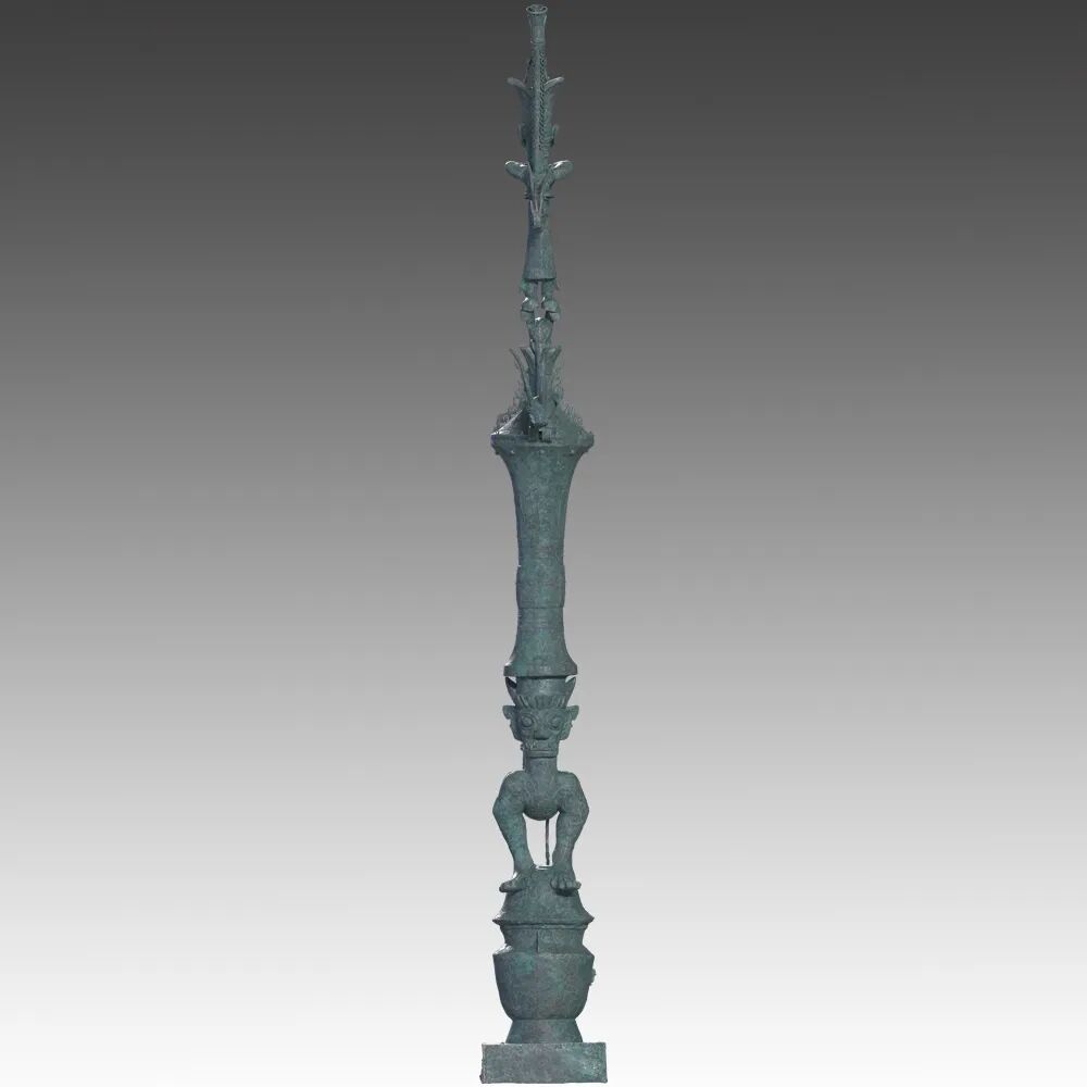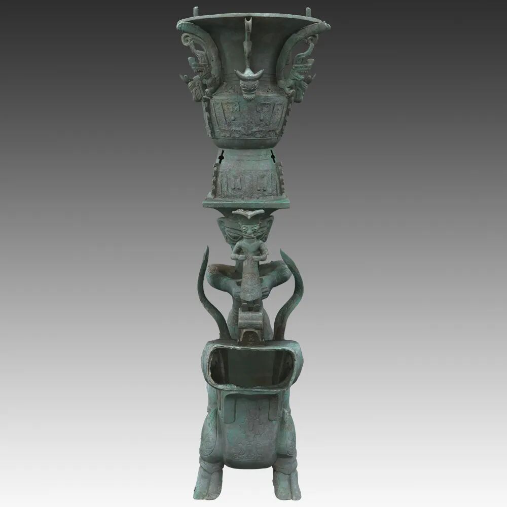 铜罍座倒立鸟足顶尊神像通高2.53米,四部分构成。由出自1986年发掘二号坑出土的铜鸟足人像、2021年三号坑出土的爬龙铜器盖、2022年八号坑出土的铜顶尊撑罍曲身人像、铜持龙立人像、铜杖形器四个部分组合而成。