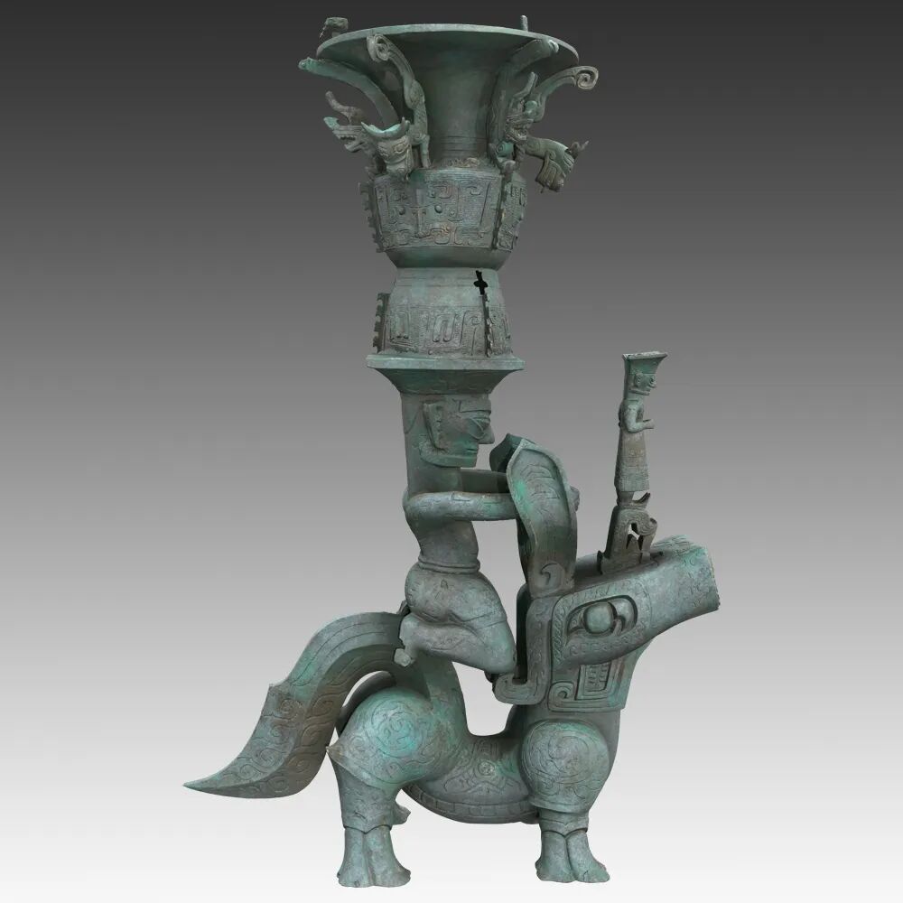 铜兽驮跪坐人顶尊铜像通高1.589米。由上、中、下三部分构成。铜像由2021年三号坑出土的铜顶尊跪坐人像和1986年二号坑出土的铜尊口沿、2022年八号坑出土的铜神兽组合而成。