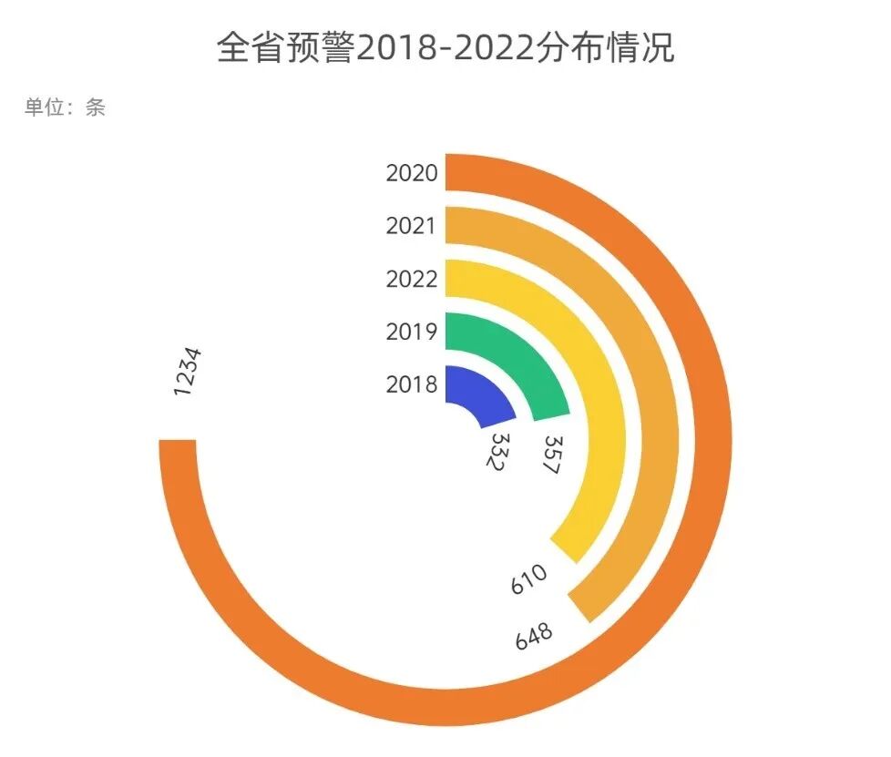 据芒种到夏至期间预警大数据统计分析显示(例如:2022年芒种到夏至期间,为6月6日0:00时至6月21日23:59:59期间有效预警统计数据),近5年全省平均每年发布预警信号636条,其中2020年发布预警数量1234条,为近5年最高峰,比发布量最少的2018年多了272%。