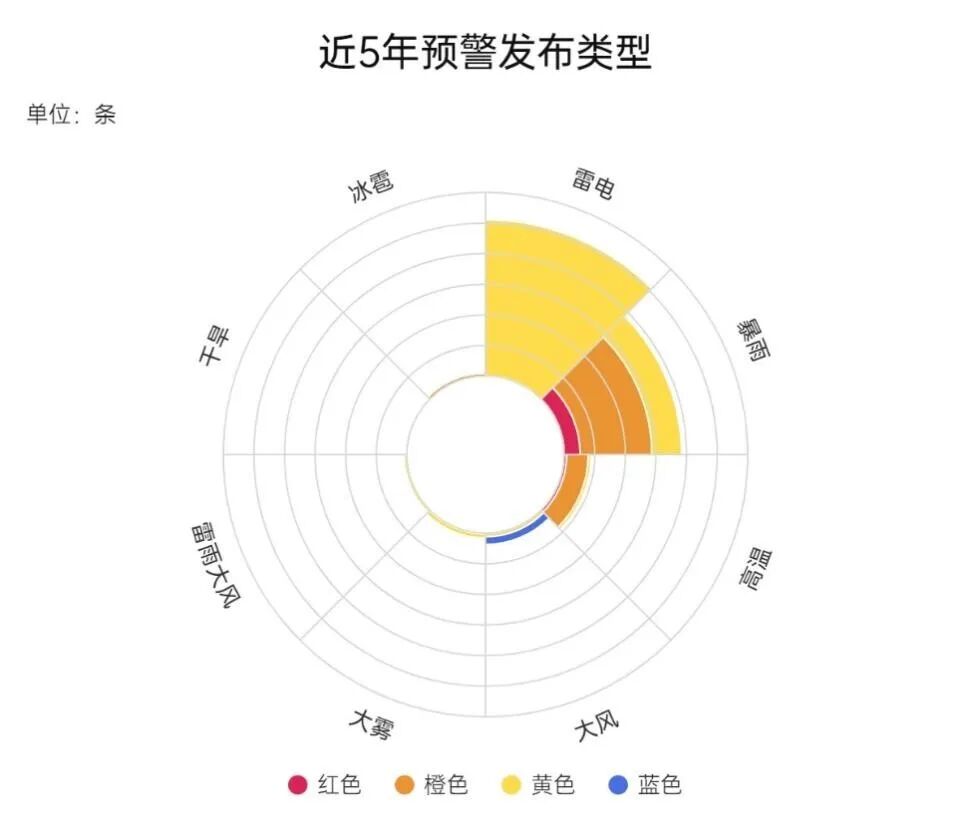 红色、橙色、黄色、蓝色预警信息分别占5.8%、29.9%、61.5%、2.8%;其中,暴雨红色预警158条、橙色预警702条,均占据红色、橙色预警首位;雷电黄色预警1530条,为黄色预警发布量之最;大风蓝色预警75条,排名蓝色发布量第一位。