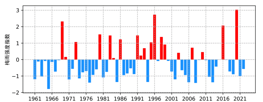湖北省梅雨强度指数逐年变化图(1961—2022年)