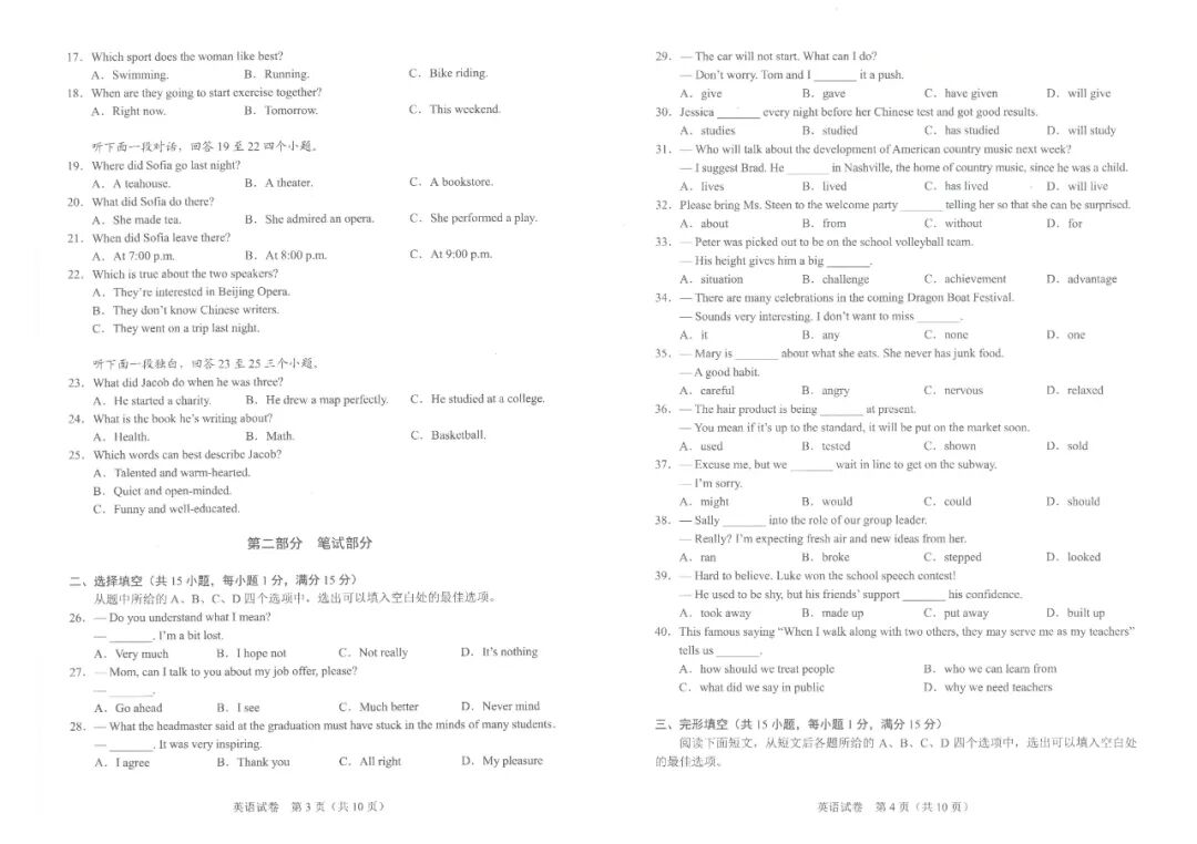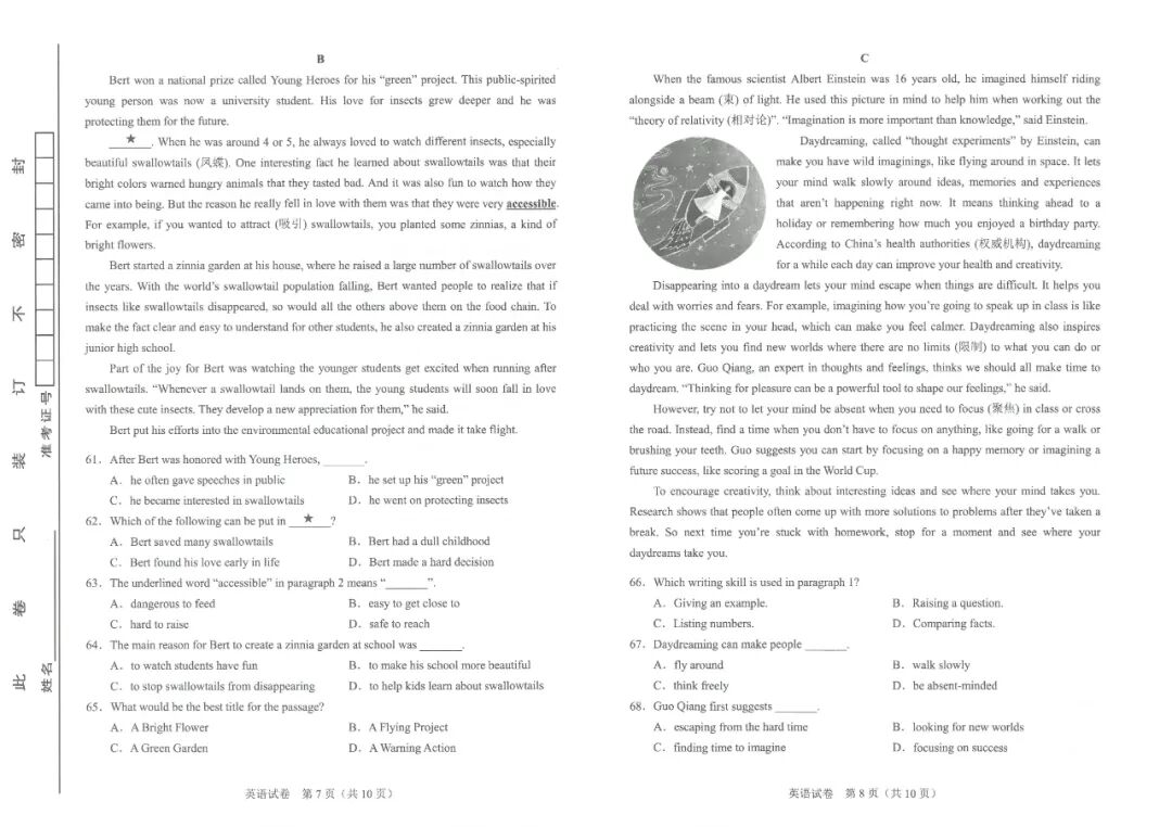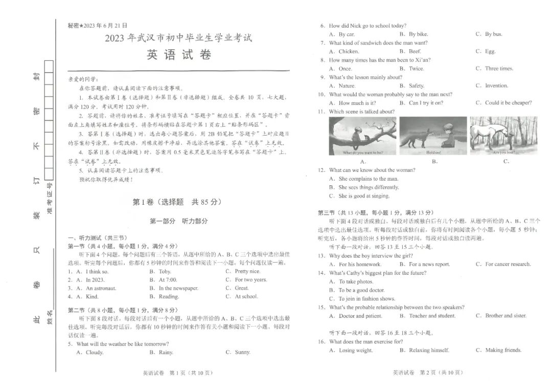 6月22日,2023年武汉中考试卷和参考答案公布。