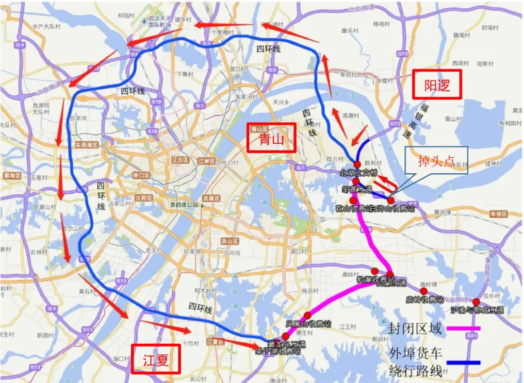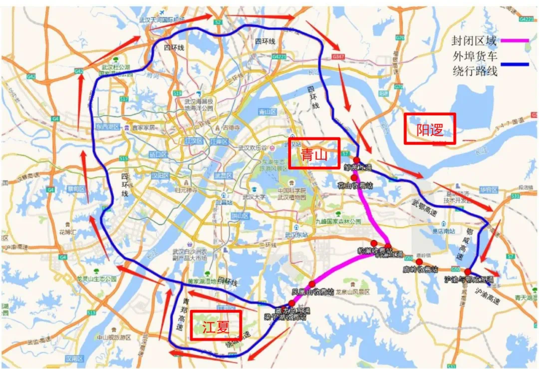 外埠货车通过藏龙岛互通→武汉四环线→邹黄互通绕行;